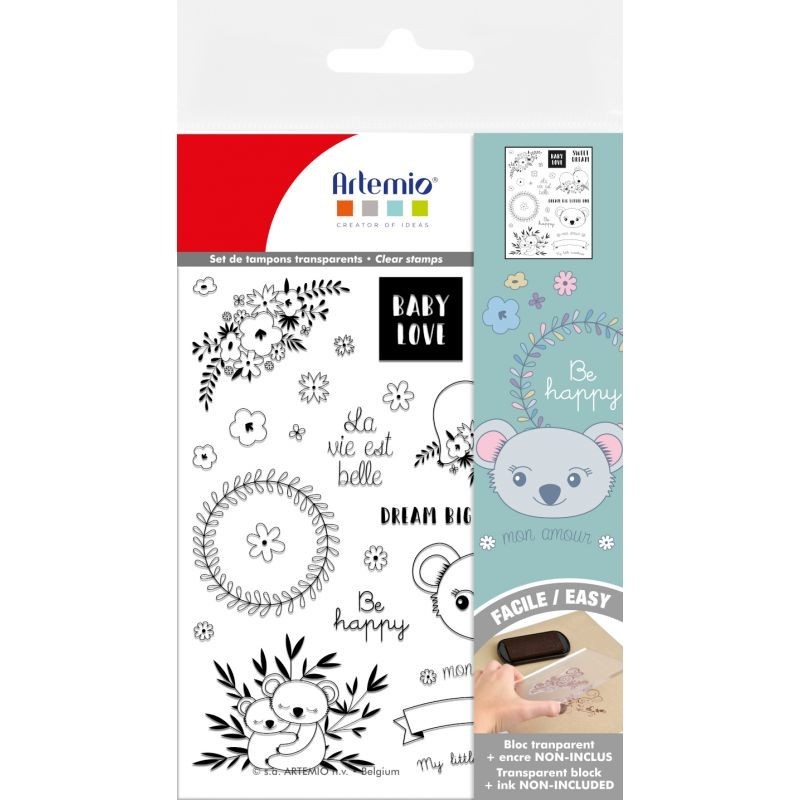 La collection Adorable comprend +/- 21 clears à utiliser avec une plateforme de tampon ou un bloc acrylique. Vous y trouverez des petites phrases à utiliser sur toutes vos créations.