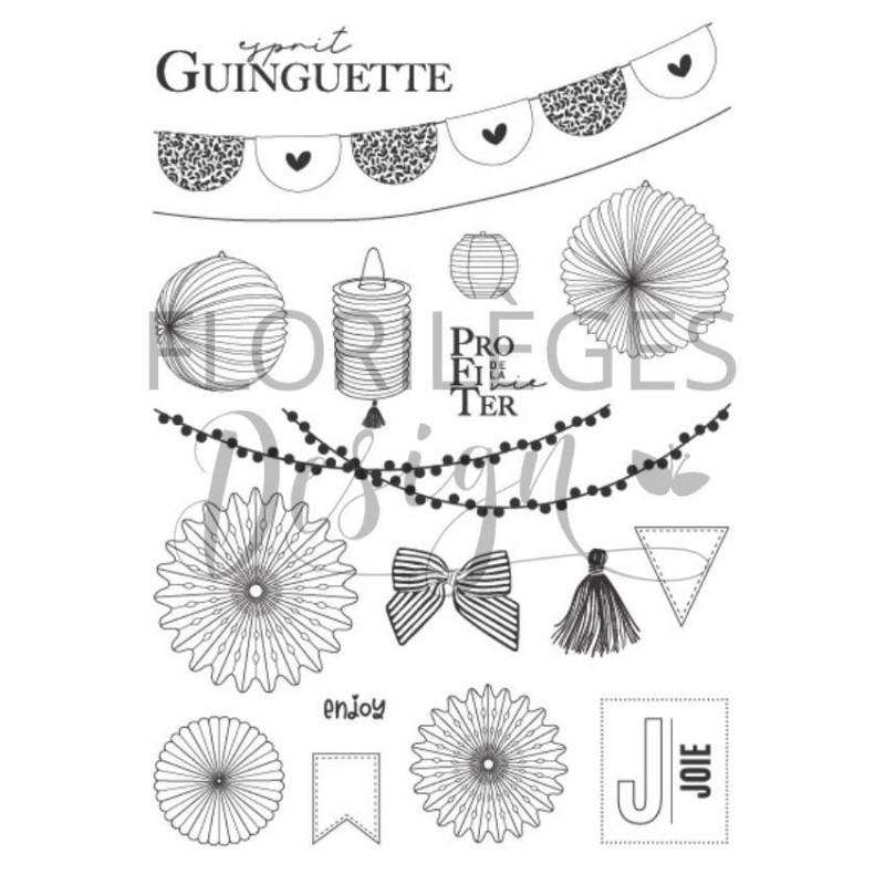 Planche de tampons clear "ESPRIT GUINGUETTE" signée Florilèges Design, idéale pour vos créations scrapbooking, carterie et journaling.