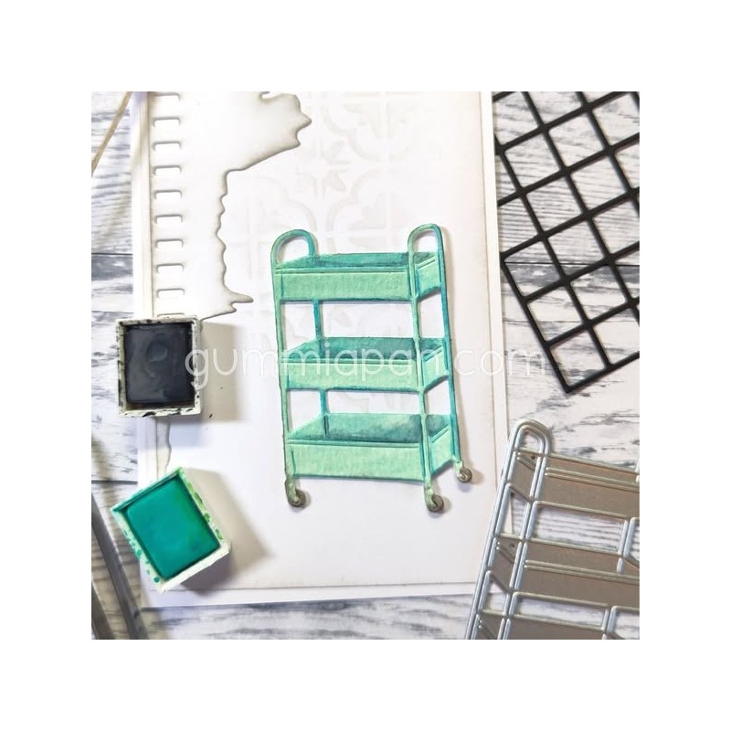 Un die en forme de petit chariot à roulettes avec étagères, parfait pour vos scènes d’atelier, scraproom ou projets créatifs.