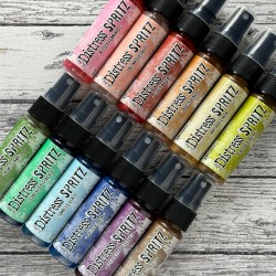 Découvrez les Distress Spritz de Tim Holtz, des sprays lumineux pour ajouter une touche de brillance colorée à vos projets.. Parfaits pour les surfaces poreuses telles que le papier, la toile et le bois, ces sprays combinent des pigments perlés dans une base fluide claire pour des résultats éblouissants.