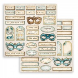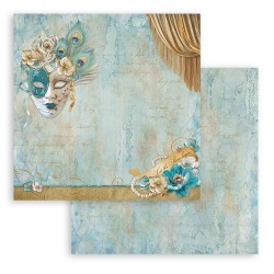 Les illustrations mettent en scène de magnifiques masques décorés, des drapés baroques, des roses veloutées, des costumes de scène, et des détails dorés qui évoquent la magie du théâtre et des soirées envoûtantes.