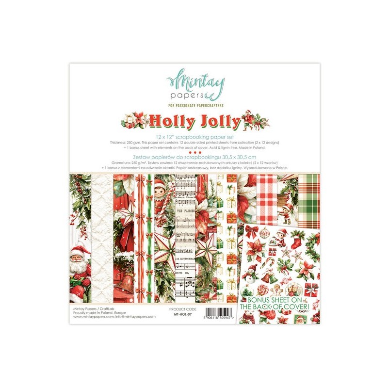 Kit de papiers 30,5 x 30,5 cm Holly Jolly de Mintay. Une collection festive et colorée pour vos créations de scrapbooking et projets de Noël.