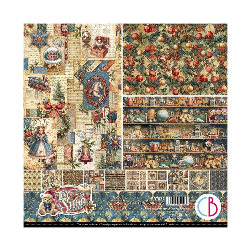 Kit de papiers 30,5 x 30,5 cm Toy Shop de Ciao Bella. Une collection de Noël pleine de charme, inspirée des vitrines de jouets traditionnels, parfaite pour scrapbooking et carterie